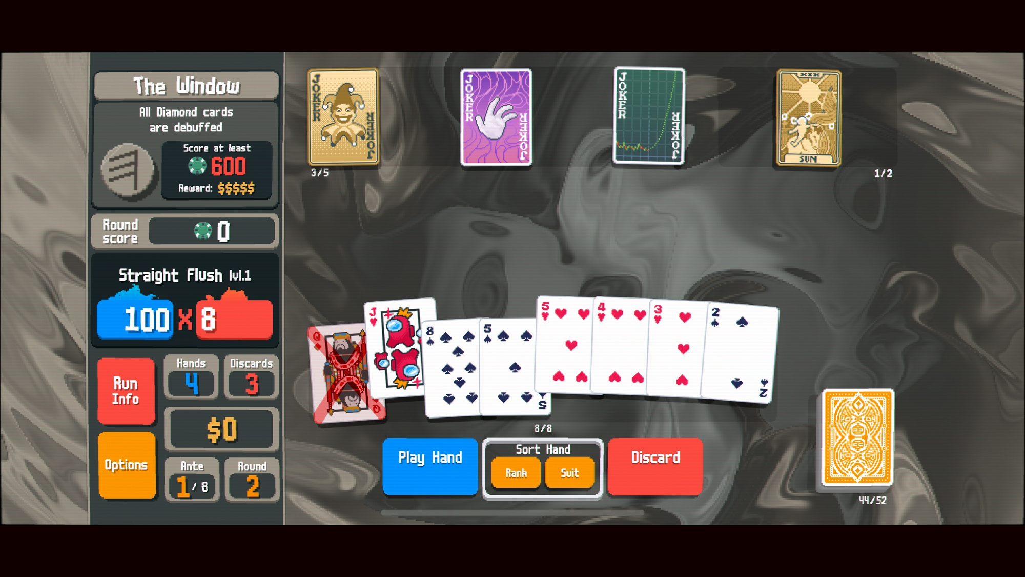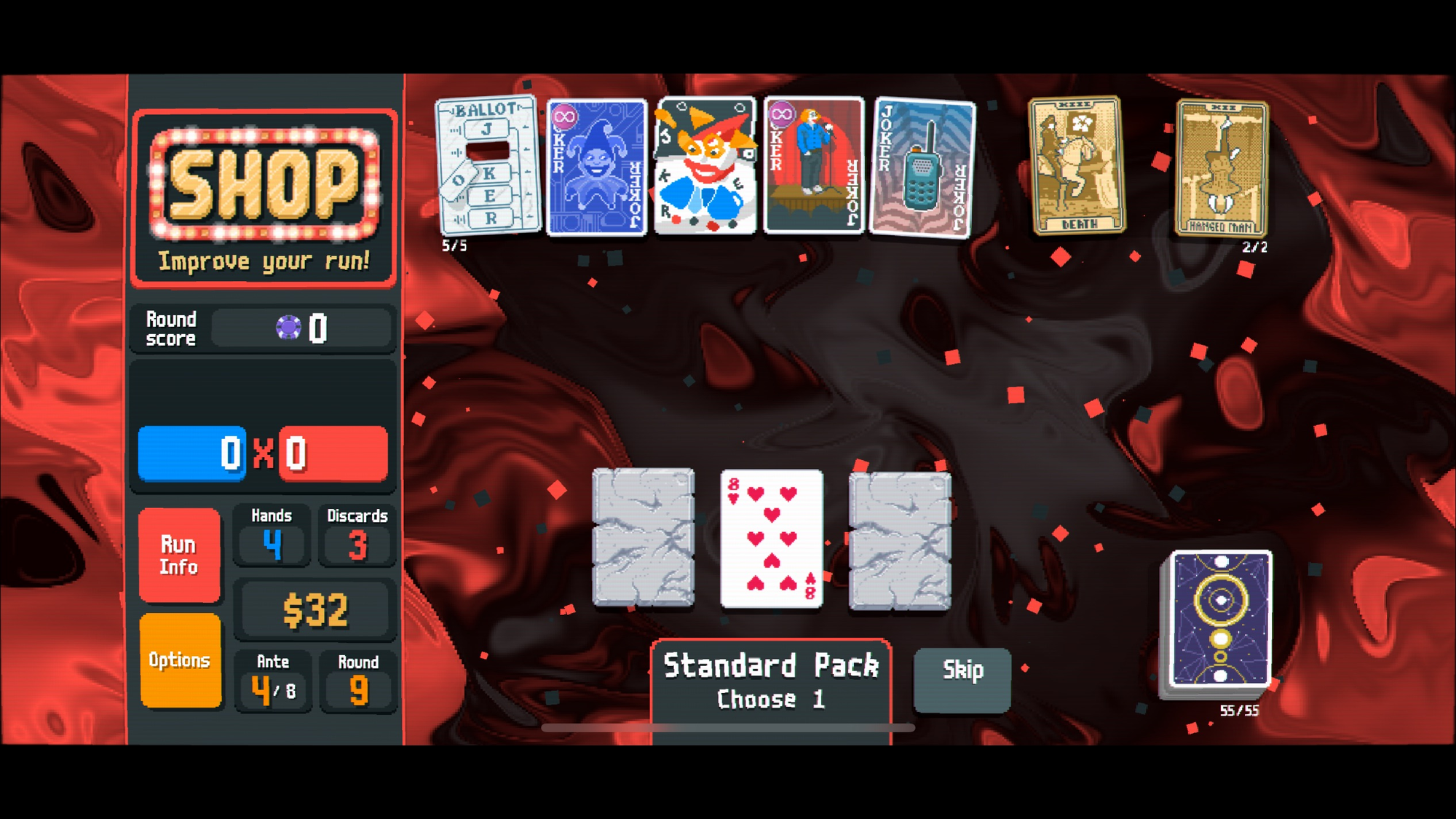 When you start up Balatro for the first time, you see the face of a whimsical little jester floating around your screen, showing you the ropes. Draw some playing cards, play a poker hand to earn points (aka “chips”), or use a discard if you don’t like your options. Keep playing until you reach a certain score, or until you run out of hands to play. This is all simple enough, until you win your first round along with some money to spend in the shop, which is when things start to open up.